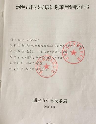 烟台海研制药有限公司与中国农业大学烟台研究院为期3年的合作研究项目,近期顺利结题。研究成果达到了预期目标,得到了验收专家一致认可。该项目为烟台市科技发展计划项目,从2014年10月开始实施,中国农业大学烟台研究院李华教授为课题组负责人。