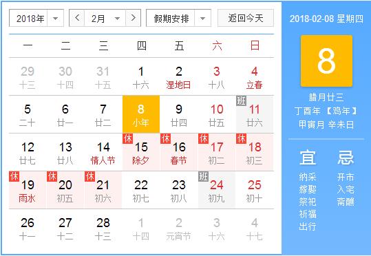 春节放假时间:2018年2月9日(周五)至2018年2月22日(周四);2018年2月23日(周五)正常上班。