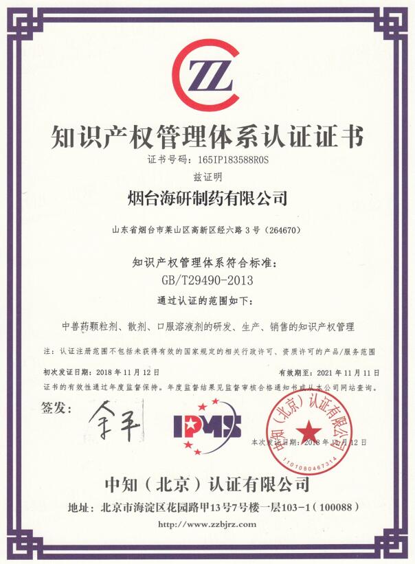 热烈祝贺海研制药通过知识产权管理体系认证(贯标认证),成为畜牧行业内获得此项殊荣的动物保健品研发生产企业,标志着海研制药在知识产权创造、运用、管理和保护方面全面迈入国内先进水平。